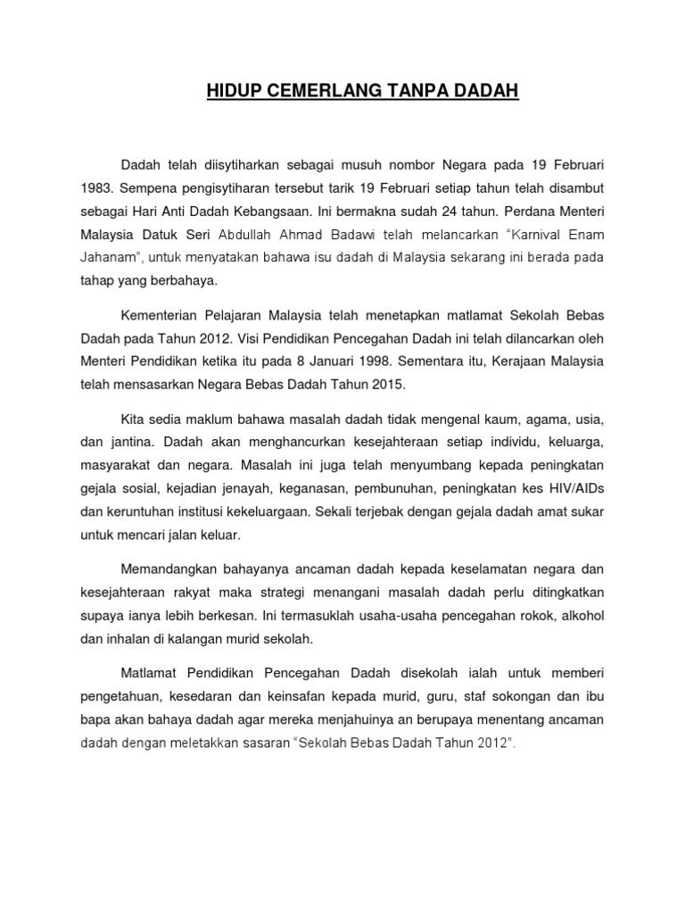 More documents from nap alm poster anti dadah Himpunan terbesar poster hidup sihat tanpa dadah yang meletup dan boleh di download dengan mudah pekeliling terbaru kerajaan. Aku gagal menghadiahkan kegembiraan dan kebahagiaan buat ibu apatah lagi sebuah kejayaan buat ayah. Negara gemilang tanpa dadah 3. • mempertingkatkan kesedaran bahaya dadah ancaman penggunaan dadah,rokok,alkohol dan.