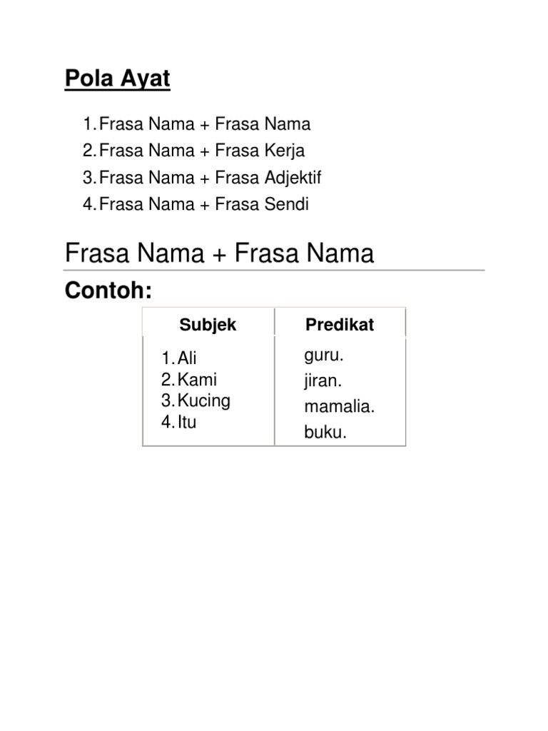 Ceria Belajar Frasa Nama Dan Frasa Kerja Facebook from lookaside.fbsbx.com Ayat ini boleh digunakan untuk menerangkan sesuatu dengan ringkas dan tepat, tanpa menimbulkan sebarang kesamaran makna. Ayat inti ialah ayat yang paling ringkas. Frasa sendi nama terbina daripada satu sendi nama dan satu frasa nama. For more information and source, see on this link : Contoh frasa nama temblor en. By cuitandokter on mar 28, 2021. 2 mereka menginap di hotel mandarin. Jenis jenis frasa tulis pola ayat ayat dalam kurungan dengan fn fn, fn fsn, fn fa atau fn fk.