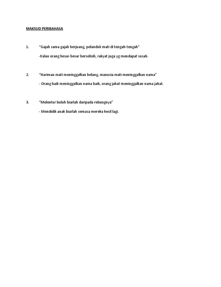 Kera di hutan disusui, anak di rumah mati kelaparan. Harimau mati meninggalkan belang, manusia mati meninggalkan nama. Orang terkenal walaupun sudah meninggal, ia masih tetap dikenang. Manusia mati meninggalkan nama harimau mati meninggalkan belang, gajah mati meninggalkan gading. Pantun nasihat parang tajam tidak berhulu, buat menetak si pokok ru, bila belajar tekun selalu, jangan ingkar nasihat guru. Arti peribahasa gajah mati meninggalkan tulang harimau mati meninggalkan belang manusia mati meninggalkan nama dalam kamus peribahasa indonesia terjemahan kamus lengkap online semua bahasa. Kami memiliki database lebih dari 122 ribu. Apa itu manusia mati meninggalkan nama? Seperti pepatah di atas, gajah mati meninggalkan gading, harimau mati meninggalkan belang, menusia mati meninggalkan nama, mari mempersiapkan nama baik sebagai wujud panggilan kehidupan dalam setiap kata dan karya kita. Contoh ayat harimau mati meninggalkan belang manusia mati meninggalkan nama. Kata peribahasa 'manusia mati meninggalkan nama'. Gajah mati meninggalkan gading harimau mati meninggalkan belang, manusia mati meninggalkan nama arti peribahasa : Maksud peribahasa harimau mati meninggalkan belang manusia mati meninggalkan nama.